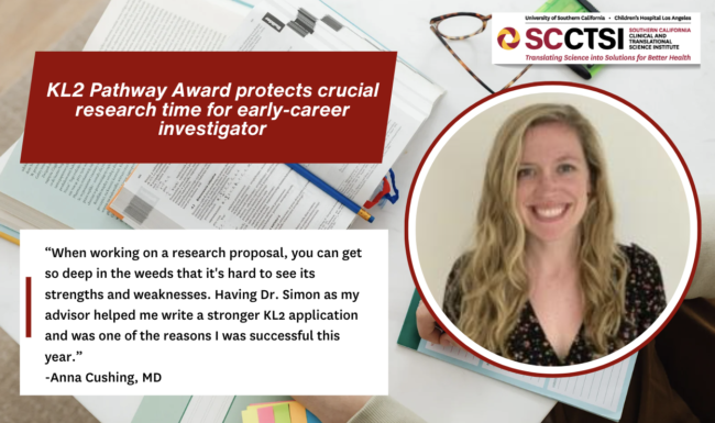 “The Pathway Program is a way to bolster the early careers of folks at CHLA who are looking to launch their research careers,” said Tamara Simon, MD, MSPH, FAAP. She is the CHLA site Principal Investigator for SC CTSI and Professor of Pediatrics (Clinician-Scholar) with the Keck School of Medicine of USC. “We were very excited to have Dr. Cushing as our first pathway awardee because she has been doing important work, and we wanted to see her momentum continue.”