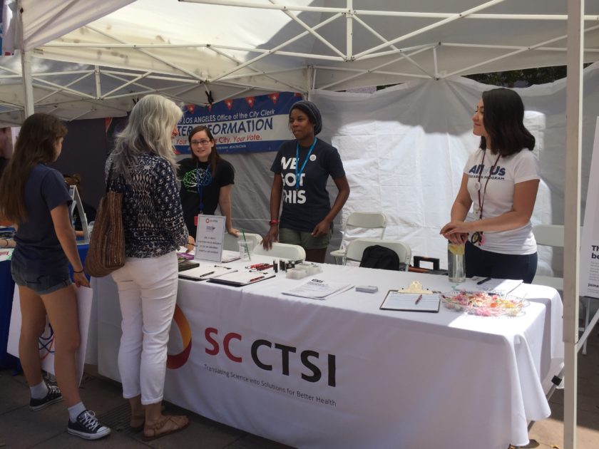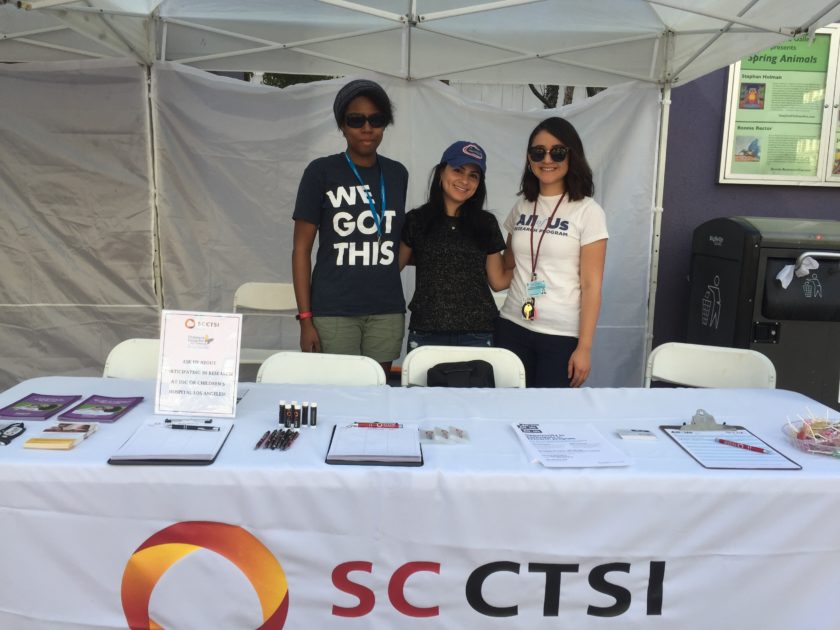 SC CTSI team members gave out information and explained how members of the community can get involved with ongoing studies and trials at USC and CHLA. They talked to the public about what it means to participate in research, its importance to science, and addressed misconceptions about research. Special thanks to the USC and CHLA volunteers that staffed the booth throughout the day: Liz Rodriguez, Lauren Whitted, Nicki Karimipour, Candice Mulder, Cynthia Cisneros, and Miles McNeeley.