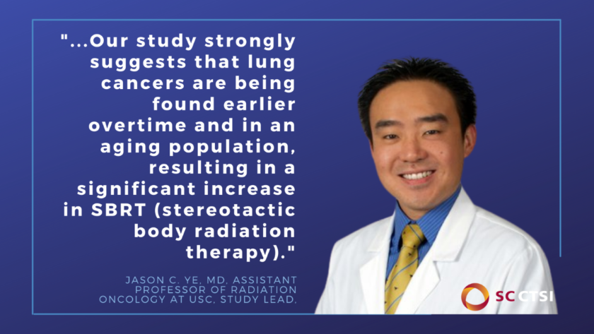 Ding collaborated on a joint USC-SC CTSI study to understand patterns of SBRT selection by patients and effectiveness in reducing tumor size. The team analyzed data from the National Cancer Database from 202,367 patients. The researchers evaluated patient choice and tumor outcomes from both SBRT and surgery for individuals with early-stage primary non–small cell lung cancer (NSCLC) from 2004 to 2016. The team, led by Jason C. Ye, MD, Assistant Professor of Radiation Oncology at USC, published findings in the April 2022 issue of the American Journal of Clinical Oncology.