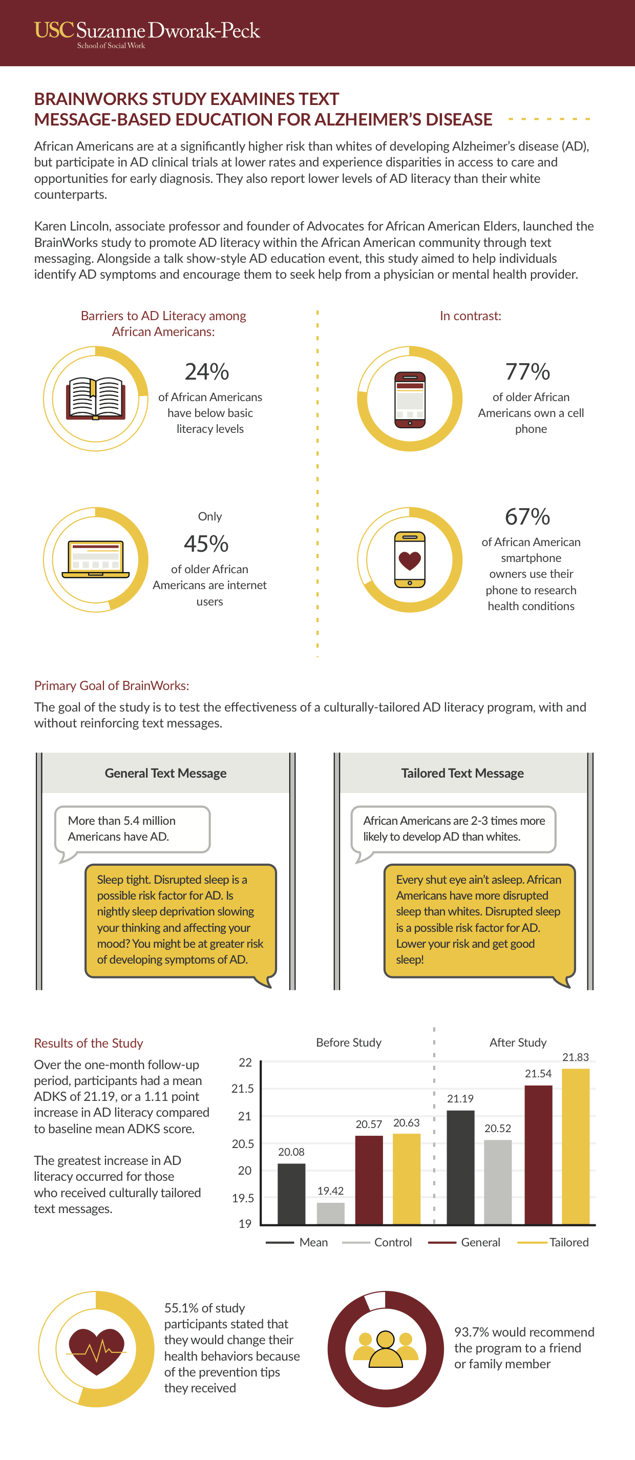 Unfortunately, transmitting health information effectively to the public can be tough. Not everyone wants to read articles or pamphlets about serious medical topics, or scour the internet for the latest research and recommendations. That was the problem facing Karen Lincoln, MSW, MA, PhD., associate professor of social work in the USC Suzanne Dworak-Peck School of Social Work, who studies Alzheimer's education in the African American community.