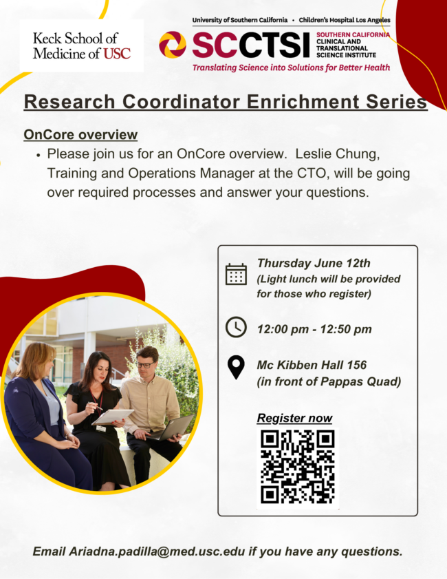 - Please join us for an OnCore overview. Leslie Chung, Training and Operations Manager at the CTO, will be going over required processes and answer your questions.